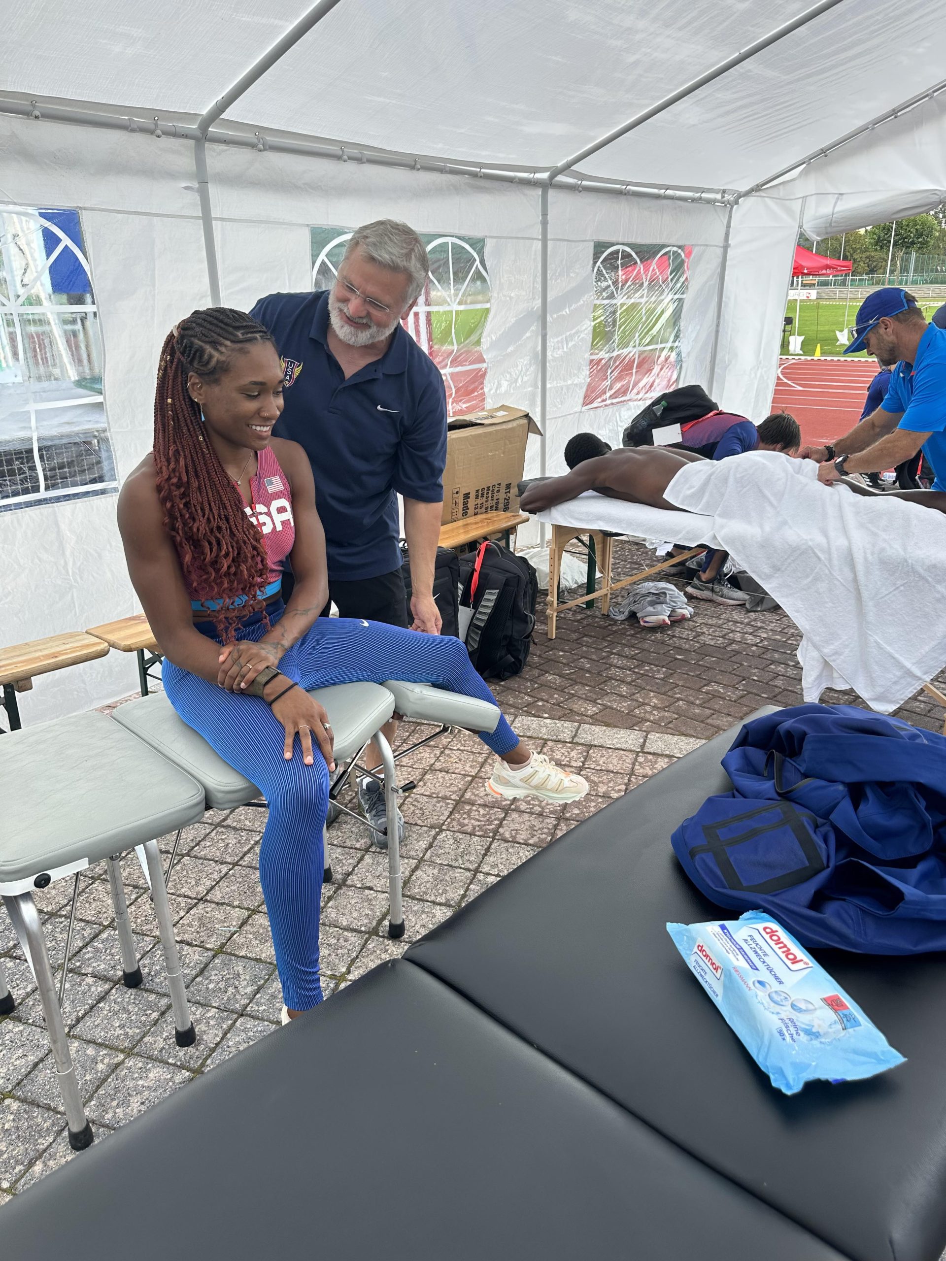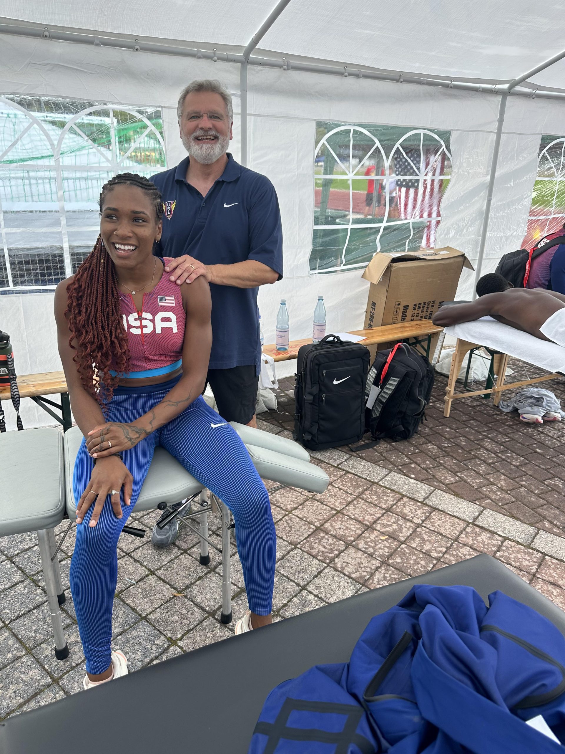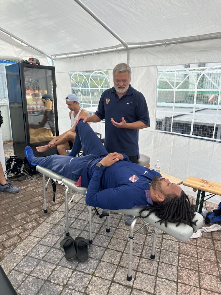 The Draegers did not expect their role at the competition in Germany to be so pronounced. However, due to the many years Dr. Curt has spent working with the U.S. Track and Field team and his connections with the coaches and administration, the IPS team was stationed in the official medical tent. There, they treated nearly the entire team, including the winner of the heptathlon, Michelle Atherley, runner-up Erin Marsh, and third-place finisher Devon Williams. They also extended their expertise to German athletes and even Lindon Victor from Grenada – a favorite to compete for his country in the 2024 Summer Games!